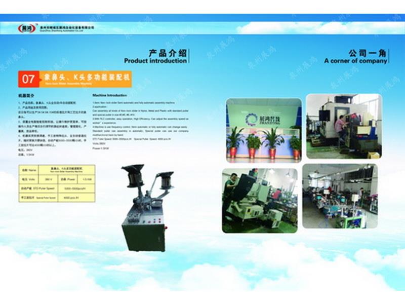 ??泉州市展鴻自動(dòng)化科技有限公司始創(chuàng)于2003年,是一個(gè)集研發(fā)、制造、銷售為一體的現(xiàn)代化公司,專業(yè)從事研發(fā)、生產(chǎn)各類型號(hào)的全自動(dòng)拉鏈頭裝配機(jī)。泉州市展鴻自動(dòng)化科技有限公司始創(chuàng)于2003年,是一家集研發(fā)、生產(chǎn)、銷售、服務(wù)于一體的現(xiàn)代化拉鏈頭設(shè)備智能制造生產(chǎn)企業(yè):專業(yè)從事研發(fā)、生產(chǎn)各類型號(hào)的全自動(dòng)拉鏈頭智能裝配機(jī)。亦可根據(jù)不同客戶的需求,提供適合客戶自身需要的“私人定制”式專用拉鏈頭設(shè)備及自動(dòng)檢測(cè)拉頭品質(zhì)一體機(jī)。泉州市展鴻自動(dòng)化科技有限公司始創(chuàng)于2003年,是一家集研發(fā)、生產(chǎn)、銷售、服務(wù)于一體的現(xiàn)代化拉鏈頭設(shè)備智能制造生產(chǎn)企業(yè):專業(yè)從事研發(fā)、生產(chǎn)各類型號(hào)的全自動(dòng)拉鏈頭智能裝配機(jī)。亦可根據(jù)不同客戶的需求,提供適合客戶自身需要的“私人定制”式專用拉鏈頭設(shè)備及自動(dòng)檢測(cè)拉頭品質(zhì)一體機(jī)。